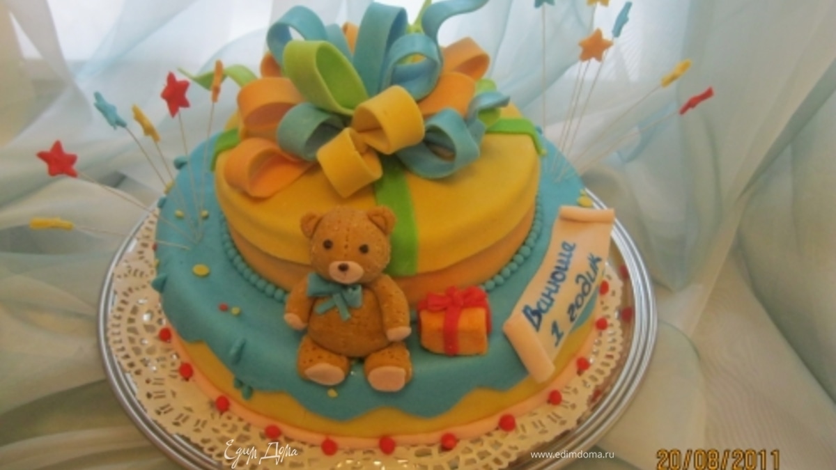- Шаг 18Поставить один ярус на другой. Из матики слепить мишку. Посадить его на торт и поздравить своего маленького именинника. Приятного аппетита.