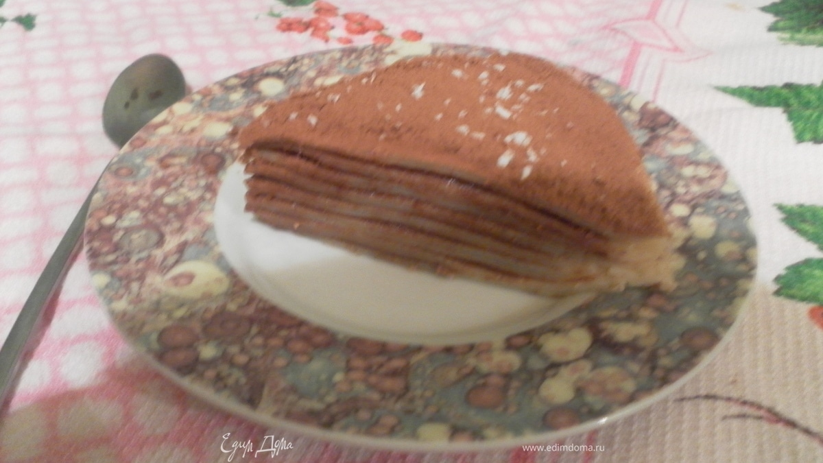 - Шаг 11)Блинчики: *Молоко влить в емкость,добавить яйцо,перемешать,добавить сахар,масло,перемешать.Постепенно всыпать муку,замесить тесто.Испечь блины на сковороде. 2)Крем: *Молоко перемешать с какао,вскипятить. *Желтки растереть с сахаром и мукой. *Желтки влить в молоко,варить до загущения. 3)Блинчики смазать кремом.Последний блинчик посыпать какао,кокосовой стружкой(по желанию). Приятного аппетита!