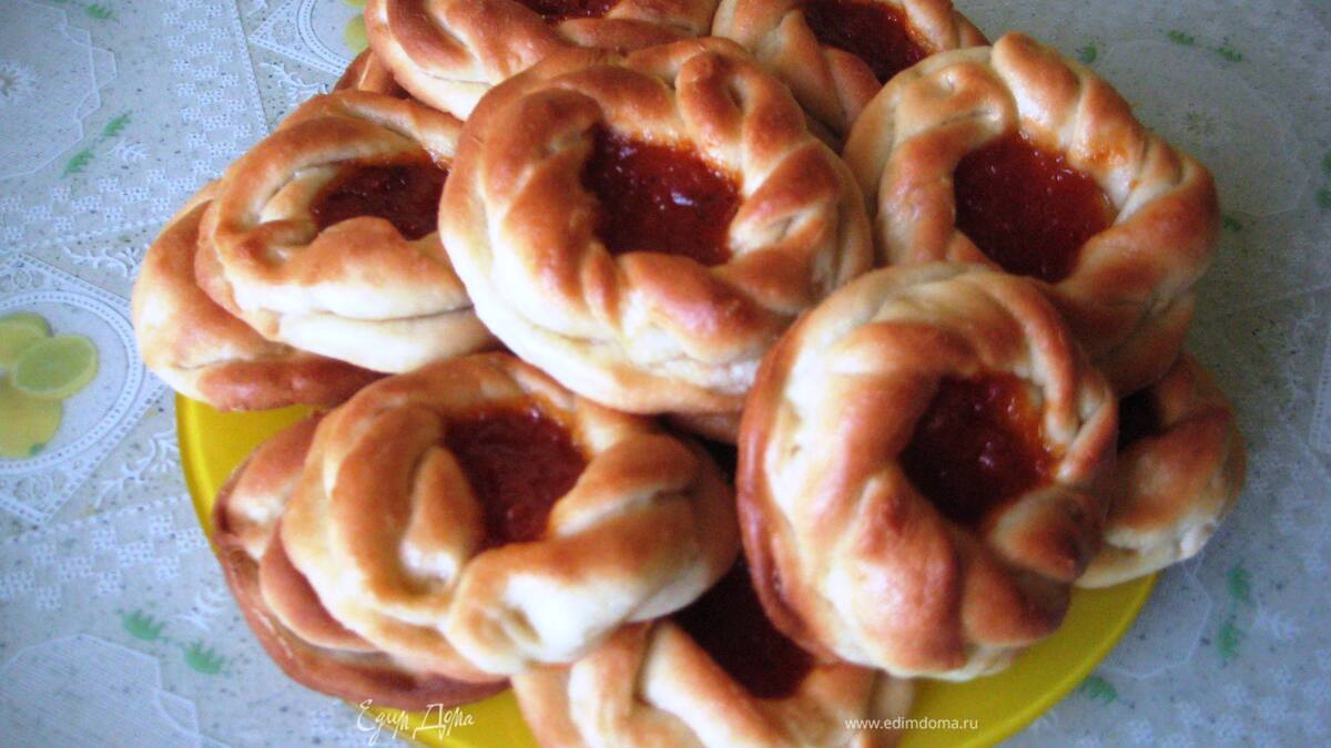Воду.сахар,6 ст.л.муки и дрожжи-хорошо перемешать.чтобы не было комочков, и оставить на 15 минут в тёплом месте,прикрыв полотенцем.Затем туда добавить подсолнечное масло,соль и оставшуюся муку-вымешать тесто и через пару минут можно "катать" булочки.Начинка любая! Приятного аппетита!