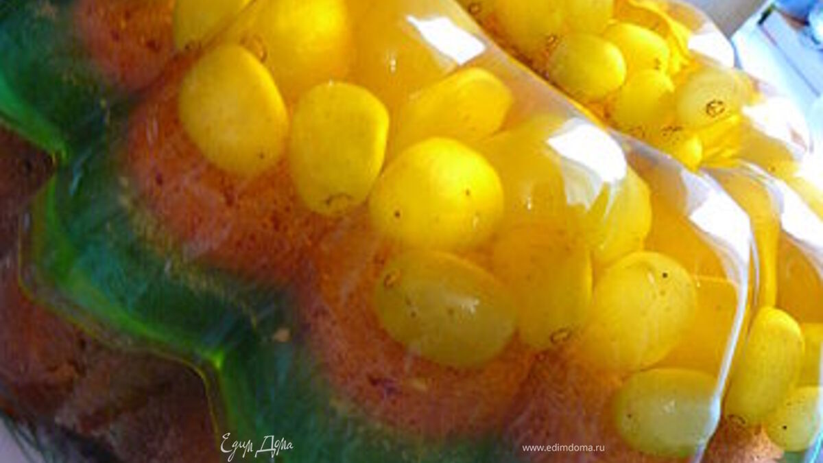 Делаем желейную заливку.Для начала из двух пачек желе приготовим желе.По рецепту который написан на пачке.Только воды берем на 50мл.меньше.То есть не 300мл.воды на одну пачку,а 250.Ну уж если вы совсем сомневаетесь с качестве желе то берите на 100мл.меньше,не 300 на пачку,а 200мл.воды.Заливаем желе водой,даем чуть остыть,а потом выливаем в форму в которой выпекали кекс.В желейный раствор ложим ягоды или мелкие фрукты.Отправляем в холодильник,до полного застывания.Если вы хотите использовать крупные фрукты,как яблоки,абрикос,ананас,то их лучше выкладывать на уже застывший первый слой желе,ну а мелкий ягоды и фрукты как виноград,клубника,малина,лучше ложить в не застывшее желе,в первый слой.