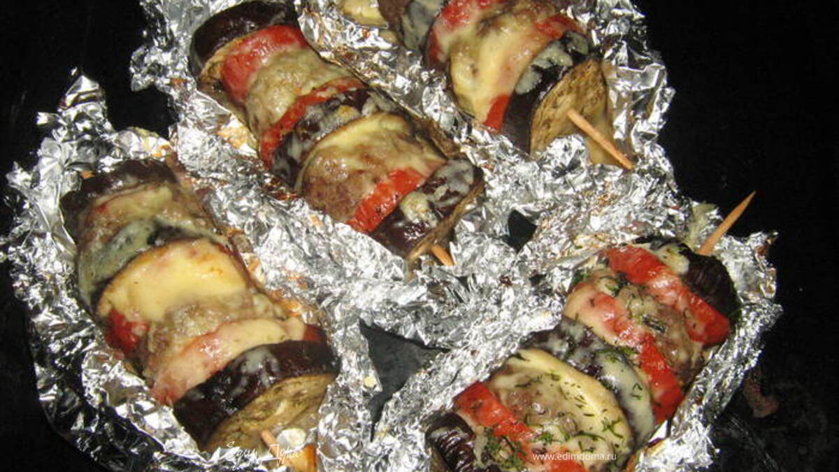 Баклажаны с мясным фаршем и сыром на шампуриках.