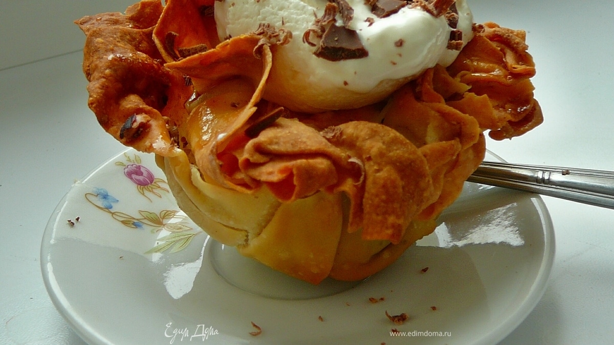 Очень вкусно такие корзинки наполнить домашним мороженым ссылка на рецепт пюре из запеченых яблок с добавлением корицы,можно еще и изюма,или же плавленным шоколадным сыром.