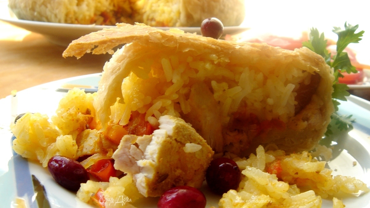 В нашем доме плов готовит мой муж.Я к рису не притрагиваюсь:у меня с ним отношения не складываются.Как шутит мой муж,я признанный мастер суши.У меня любой рис надёжно слипнется.Это мой первый опыт плововарения,если это можно назвать пловом,хотя в Азербайджане существуют виды плова с казмагом-лепёшкой из пресного теста,которую подкладывают под рис.Я предлагаю вашему вниманию тот вариант,который мне довелось недавно отведать.Плов подавался в порционных слоёных булках.Вы же можете запечь в тесте любой,любимый вами вид плова.