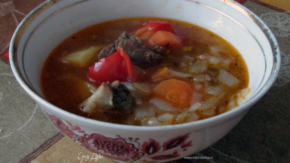 - Шаг 1Мясо, не разрезая, кладем в кастрюлю с холодной водой и варим на медленном огне 2 - 2,5 часа, периодически снимая с поверхности бульона пенку. Мясо выньте из бульона, снимите с костей, нарежьте на удобные для еды кусочки, верните в бульон. Немного посолите, добавьте специи. Традиционно для шурпы все овощи нарезаются крупно. Лук нарежьте кольцами или полукольцами, половину лука добавьте в кастрюлю. Сладкий перец нарежьте крупными дольками, помидоры – на половинки, морковь толстыми кружочками. Можно предварительно помидоры ошпарить кипятком и снять с них шкурки. Добавьте овощи в бульон. Поварите минут 15-20. Картофель нарежьте крупными кусками (на 4-6 частей). Положите в кастрюлю. Через 10 минут положите в суп оставшийся лук. Досолите. Положите пучок перевязанного укропа (часть можете оставить для сервировки). Варите до готовности картошки. Разлейте шурпу в касы, посыпьте мелко нарезанной зеленью и подавайте к столу.