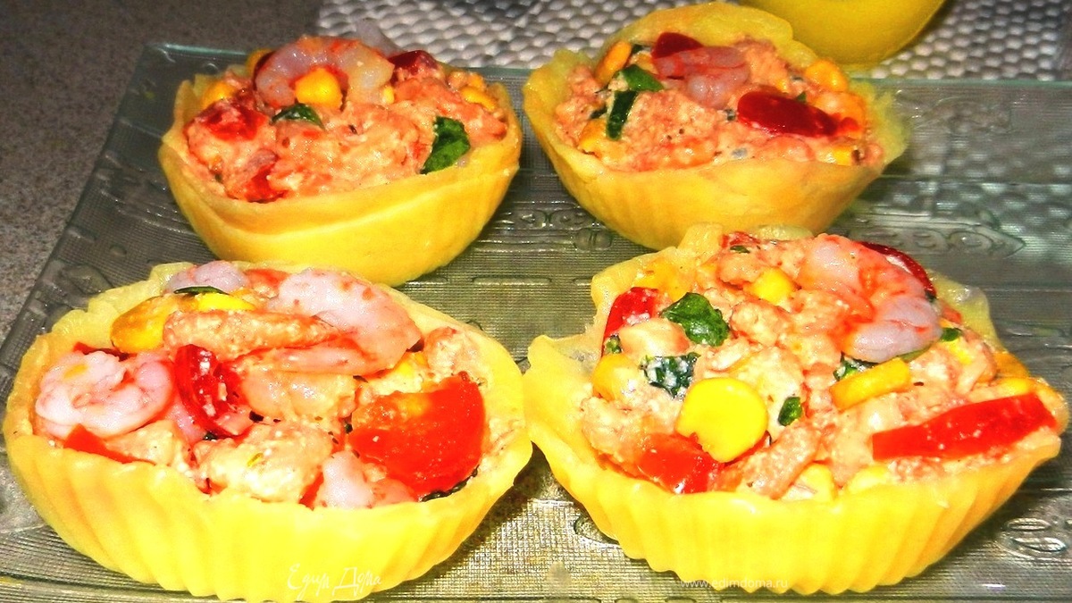 - ПодготовкаЛюбимый вкусный сыр тонко порезала, а проще взять готовую нарезку (у меня Ольттермани). Положила пластинки сыра на пергамент и поставила в микроволновку на полную мощность на 5-7 секунд, чтобы сыр стал очень мягким, но не расплавился. Полученные сырные кусочки заложила в формочки (можно просто на перевернутый стакан) и оставила на некоторое время. За это время взбила в блендере творог+йогурт+кетчуп+соль+приправу для морепроуктов. Креветки и черри порезала на средние кусочки, добавила туда кукурузу и порвала рукколу. Всё смешала с заправкой и разложила в сырные корзинки. До подачи держала в холодильнике.