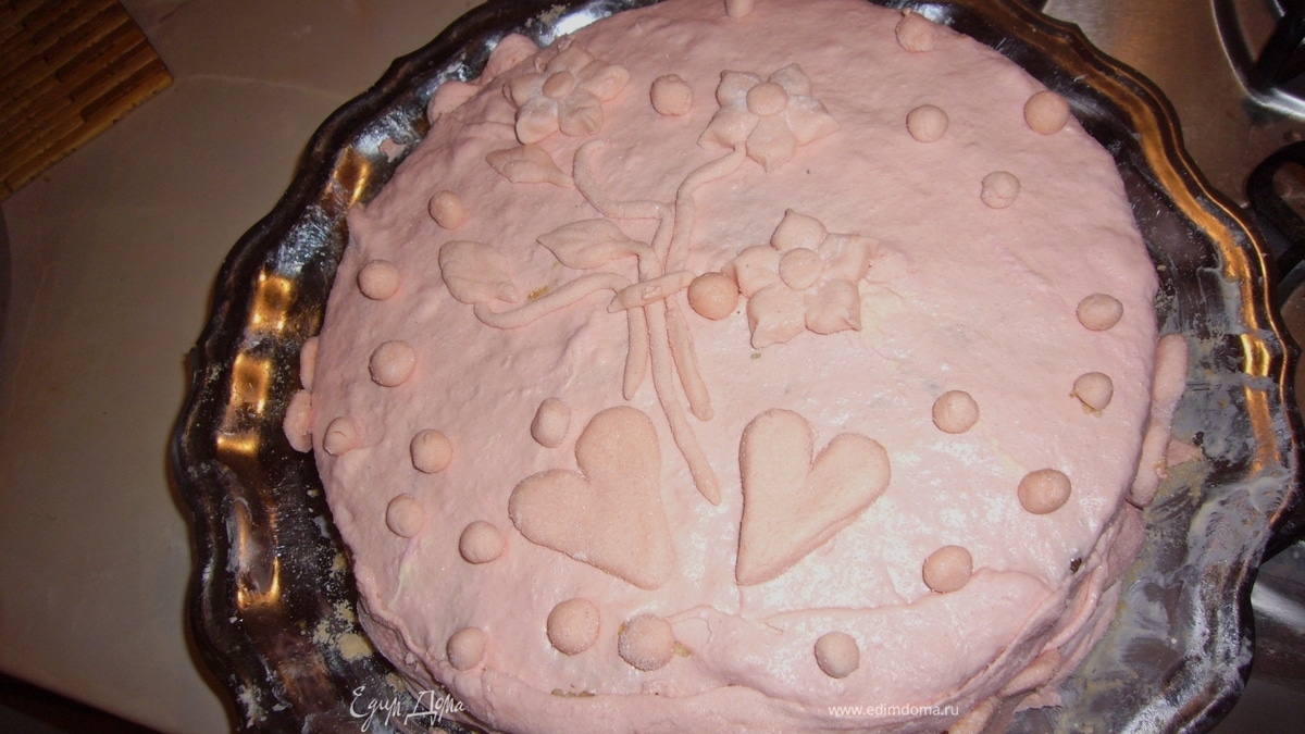 Разрезать корж на 2 части. Промазать сдивками и выложить ягоды(у меня мороженая черешня)накрыть 2-ым коржом ,покрыть торт маслянным кремом и накрыть мастикой и украсить фигурками из мастики.