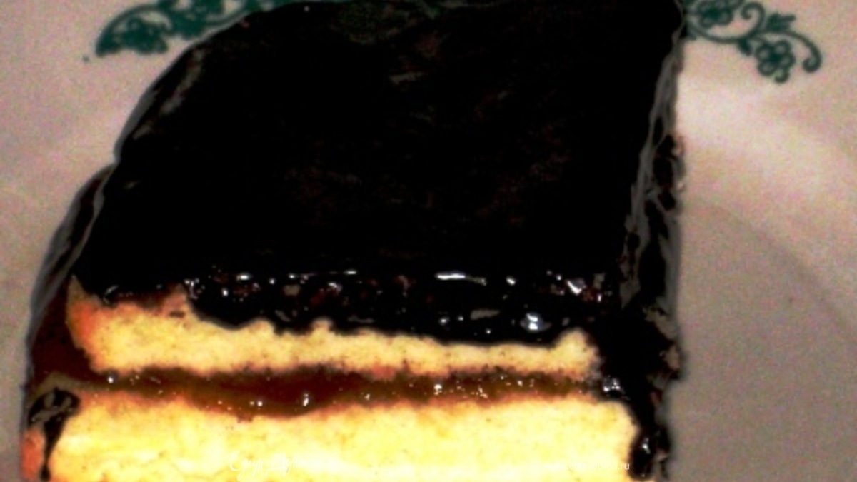 Духовка 180. Яйца взбиваем с солью до пены, добавляем сахар, взбиваем. Муку, крахмал и соду смешиваем в чашке и просеиваем в яичную смесь. Перемешиваем до однородности. Выпекаем. Пока очищаем персики, отделяем от косточки, режем и тушим с сахаром до мягкости, мин 10. Пробиваем в блендере. Готовый бисквит режем, перемазываем соусом, покрываем помадкой. Какао с сахаром намочить водой, дать закипеть, добавить корицу, горячим нанести на бисквит. Приятного аппетита!