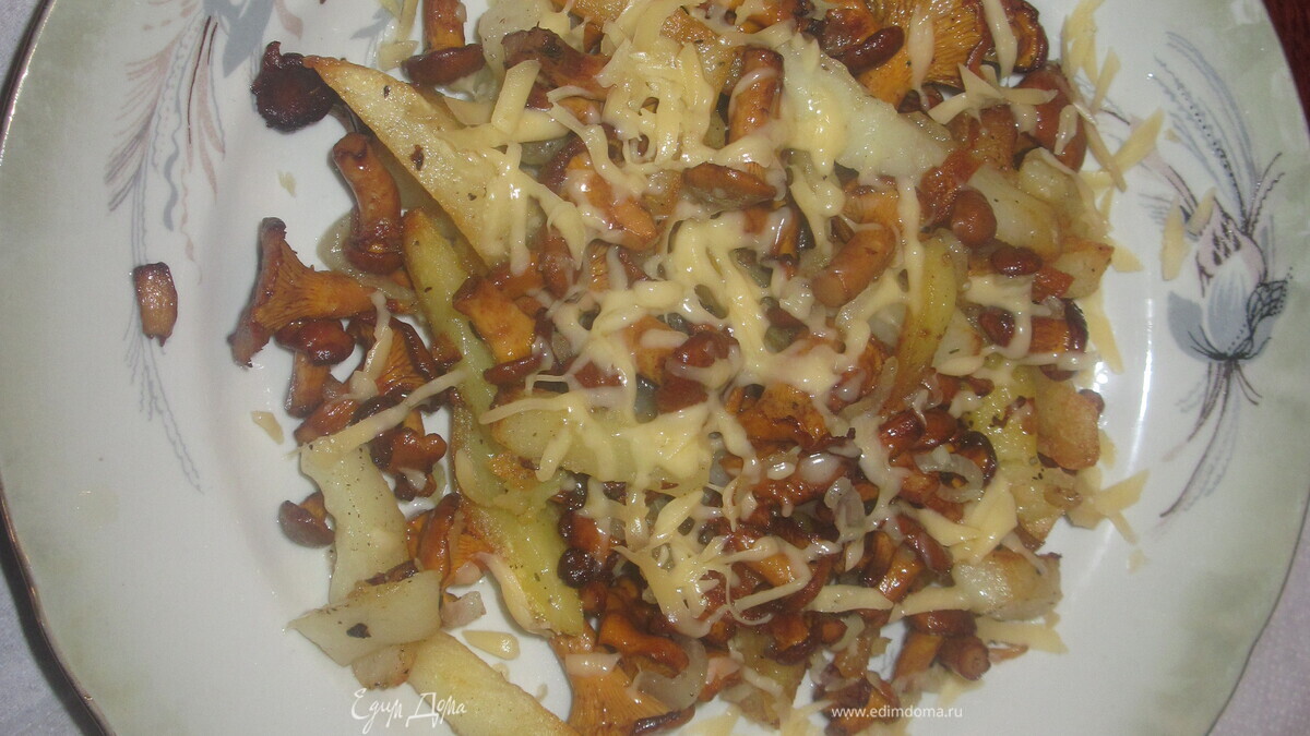 - Шаг 1Жарим грибы с луком.Отдельнно жарим картофель.Когда он готов добавляем грибы с луком и хорошо перемешиваем.Даем им минуты 3 подружиться и добавляем тертый сыр.Все это хорошо перемешиваем.Раскладываем по тарелкам и с удовольствием съедаем.