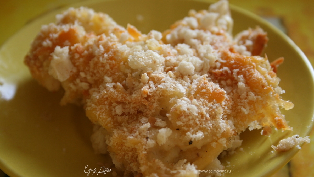 - Шаг 3Подготовленную ранее цветную капусту залейте соусом. Сверху присыпте горстью сыра, а поверх него - сухариками. Они подарят запеканке неповторимую корочку.