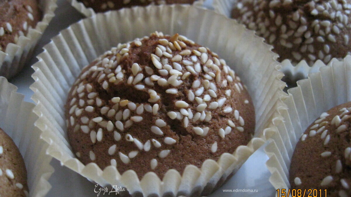- Шаг 1Взбить яйца с сахаром, добавить слив.масло, просеянную муку+крахмал+какао, а также гашен.соду и ванилин. Выпекать в формочках, посыпав орешками