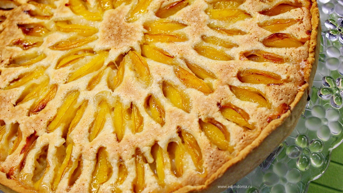 Вылить начинку на испеченное тесто. Разложить дольки слив по кругу и выпекать 50-60 минут.