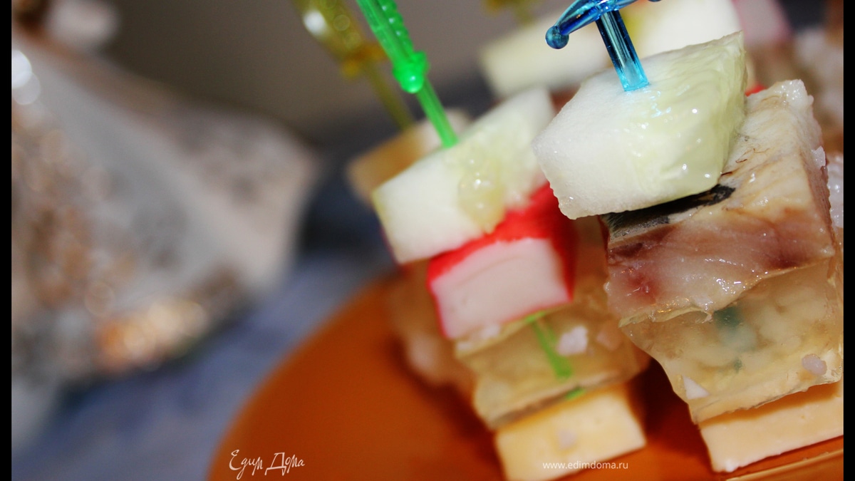 Порезать на кусочки все то, что вам необходимо для составления канапе. В моем случае это сыр, огурец, крабовые палочки и селедочка. - Шаг 9