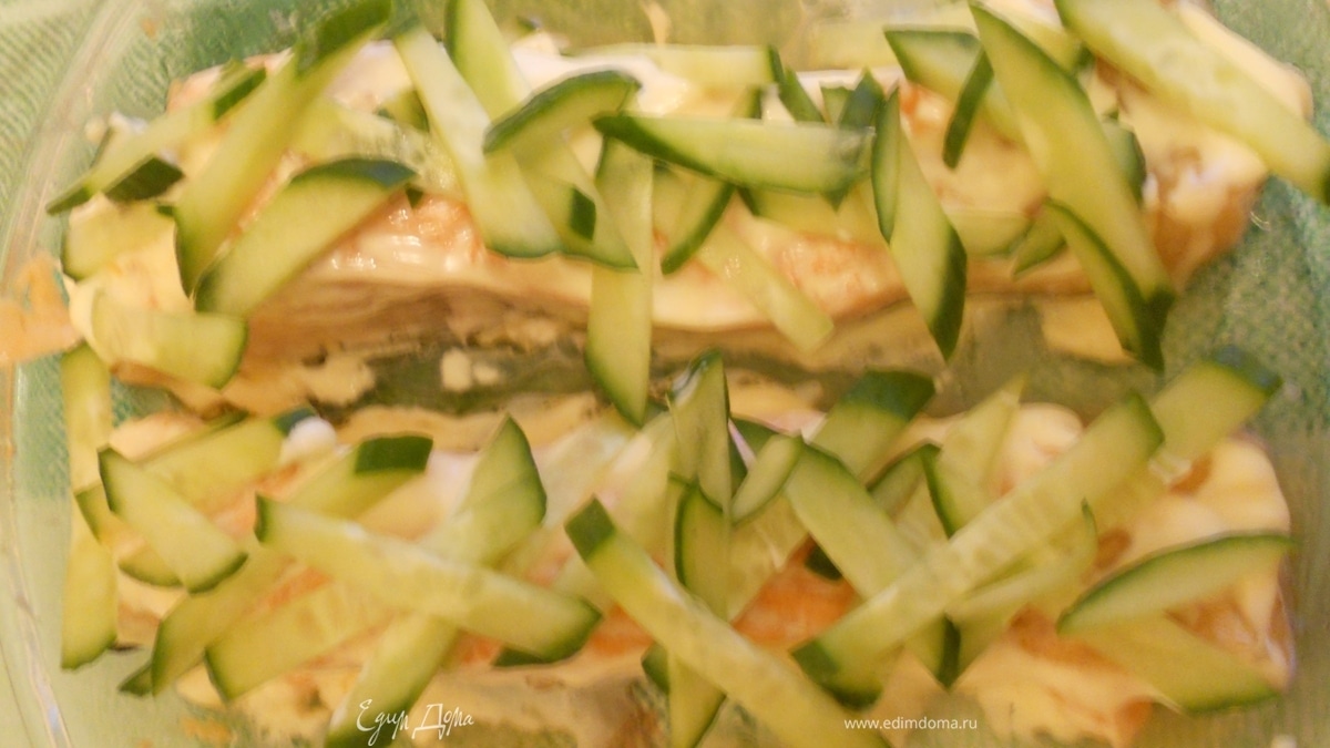 - Шаг 3опять вынимаем сверху нашей рыбки выкладываем тонко порезанный огурец, лучше соломкой, и опять в микроволновку на 2 минуты,