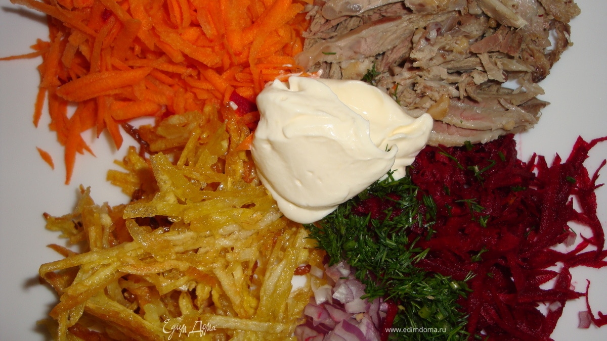 А теперь самое красивое: маленькими горстками (секторами) раскладываем продукты в порционные тарелки, в серединку кладем майонез и... зовем к столу!