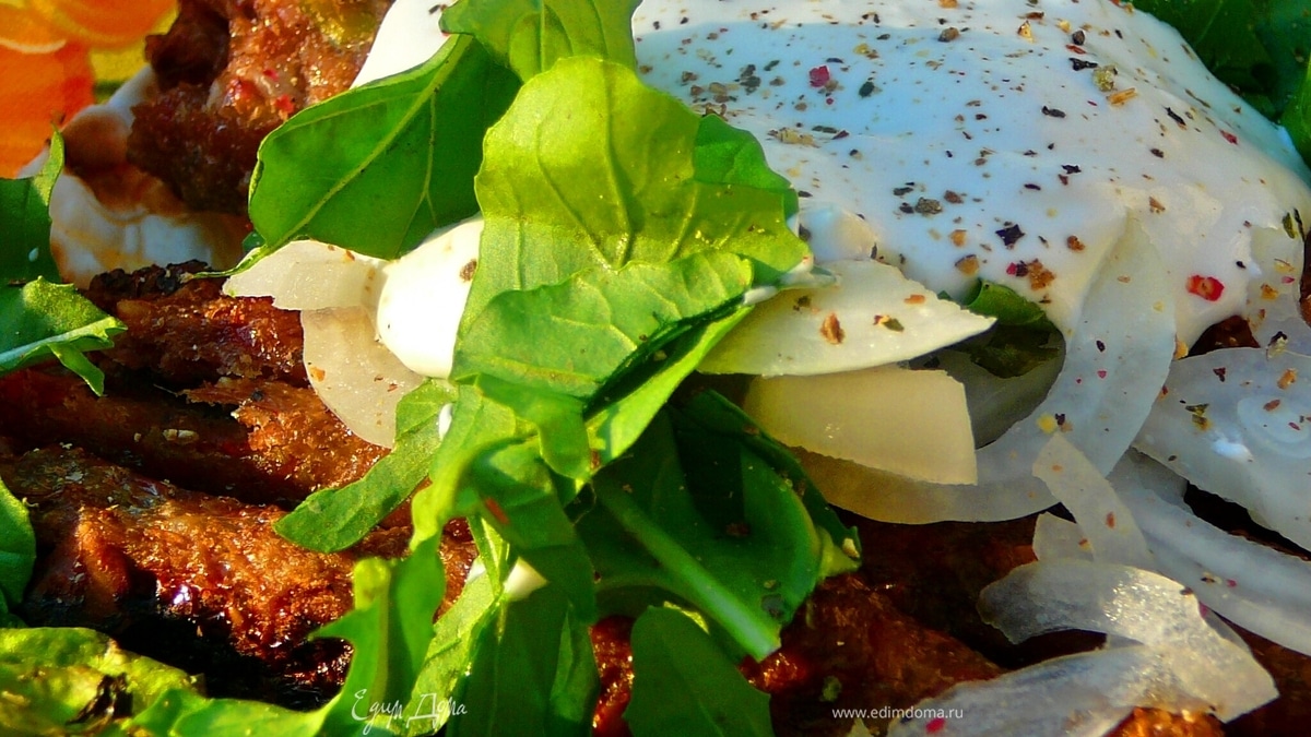 Салат вымыть,обсушить(при желании можно добавить мяту).Лук очистить,нарезать тонкими кольцами.Приправьте его солью,перцем и несколькими каплями лимонного сока,слегка подавите лук руками,добавьте рубленную(или же рваную петрушку).