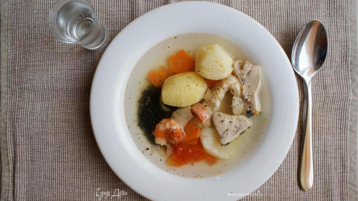 - Шаг 6Кладите креветки. Наша уха почти готова, для креветок нужно буквально 3-4 минуты варения. После этого нужно снять кастрюлю и отставить ее в сторону, уха должна чуть-чуть постоять. В это время вы, пожалуйста, доставайте тарелки, ложки, а вот хлеба лучше не надо, без него хорошо.
