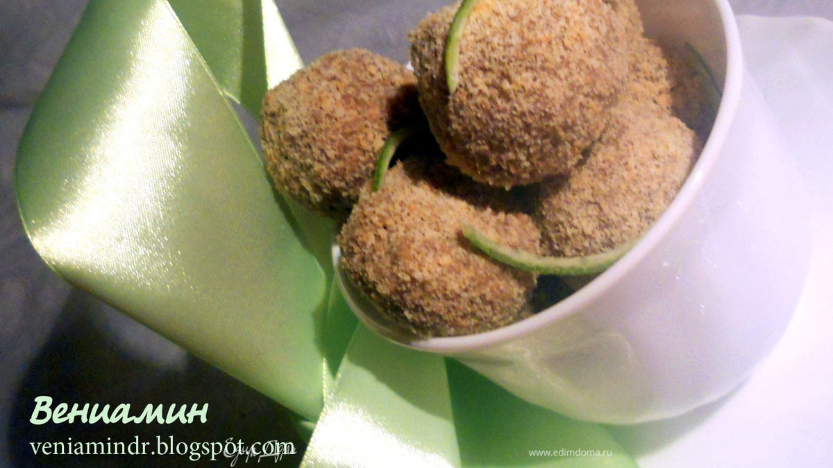 Добавить лимонный сок и цедру лайма. Сформировать конфеты и обалять в вафельной крошке. ***Поскольку мне требовалась более нежная и светлая "оболочка", я растер 5 шт. печенья "савоярди"***. До подачи хранить в холодильнике.