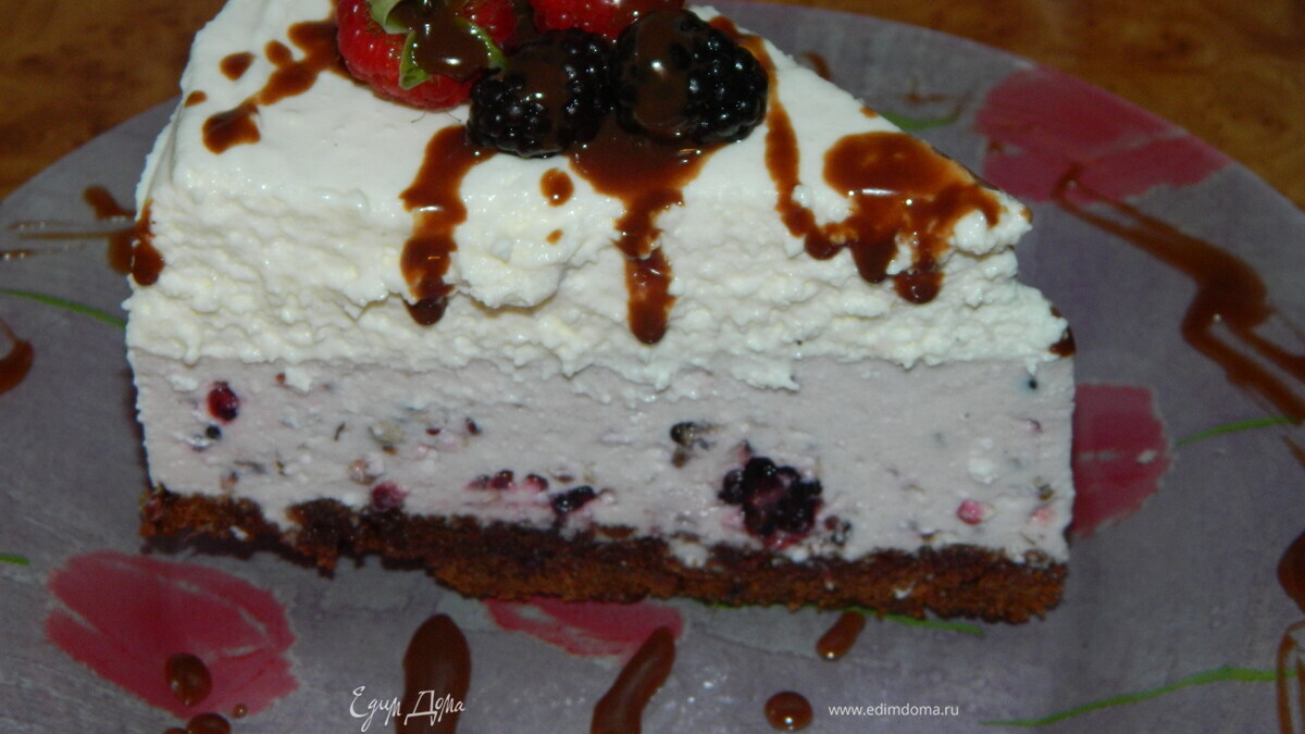 Убрала бортики.Украсила торт малиной и еживикой.Ещё немного шоколадной глазури.