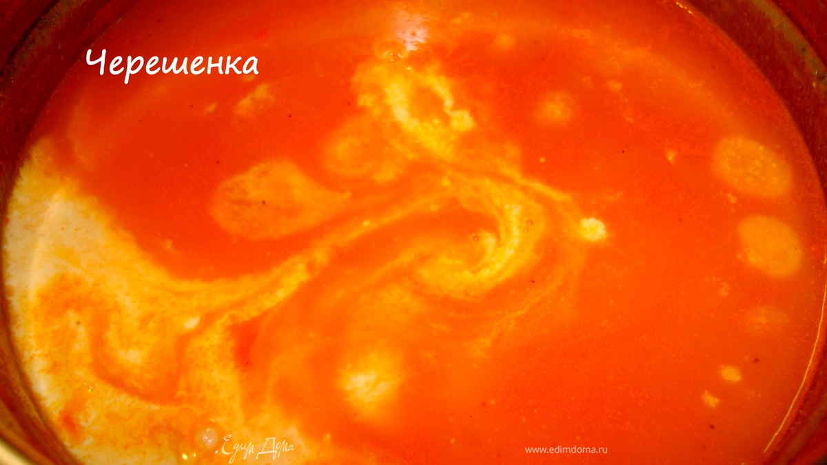 Добавить сливки, довести до кипения, но не кипятить… Имейте ввиду, что от количества сливок будет зависеть цвет готового супа, поэтому если хотите поярче, то добавьте меньше сливок и больше воды... Готовый суп подаем с тертым сыром, а при желании и с сухариками… Приятного аппетита!!!