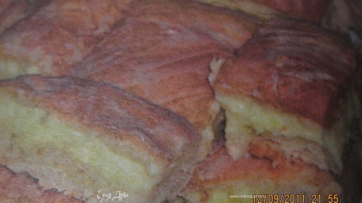 - Шаг 1Масло или маргарин растопить,соединить с остальными ингредиентами,замесить тесто,разделить на 2 части.Одну часть распределить по смазанному маслом или маргарином протвеню.