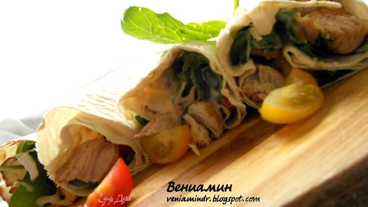 На основу выложить куриное филе, черри, шпинат, йогуртовый соус, свернуть в рулет и подавать! ***Ну в общем то красивые и ровные роллы в моем исполнение что-то из области фантастики, но в роллах все же главное - их душевность:)***