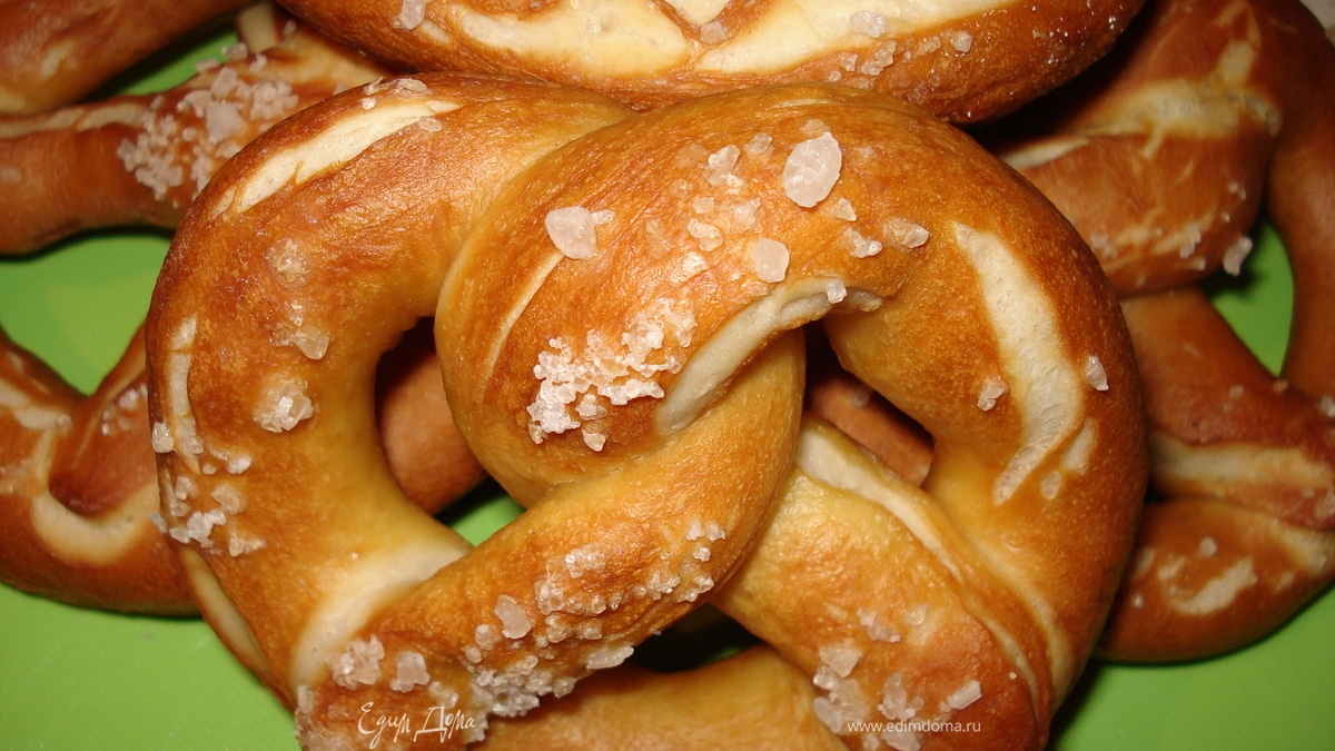 Вытащить брецель большой шумовкой ( только не алюминиевой ) и разложить на противень, застеленный бумагой для выпечки (лучше всего брать не бумажную , а многоразовую которую можно мыть или силиконовый коврик, а то брецели к бумаге прилипнуть могут), или же смазать противень маргарином. Сверху брецель слегка разрезать и теперь можно посыпать крупной солью, или сезамом, или маком, или же тёртым сыром. Выпекать 15 мин, до красивого цвета.