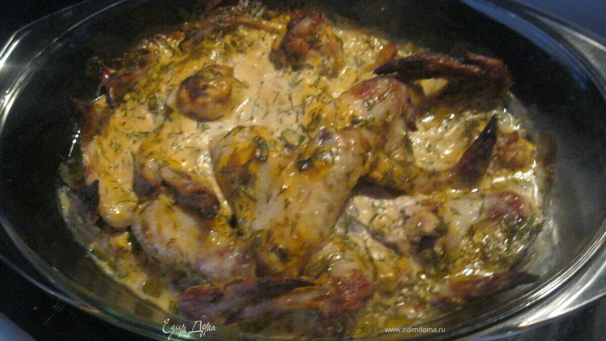 Маринад: Майонез, кетчуп, соус с чесноком, зеленый лук, укроп смешиваем с крыльями поставить в холодильник на 1 - 2 часа. - Шаг 2Запекаем в духовке 1-2 часа при температуре 180 градусов