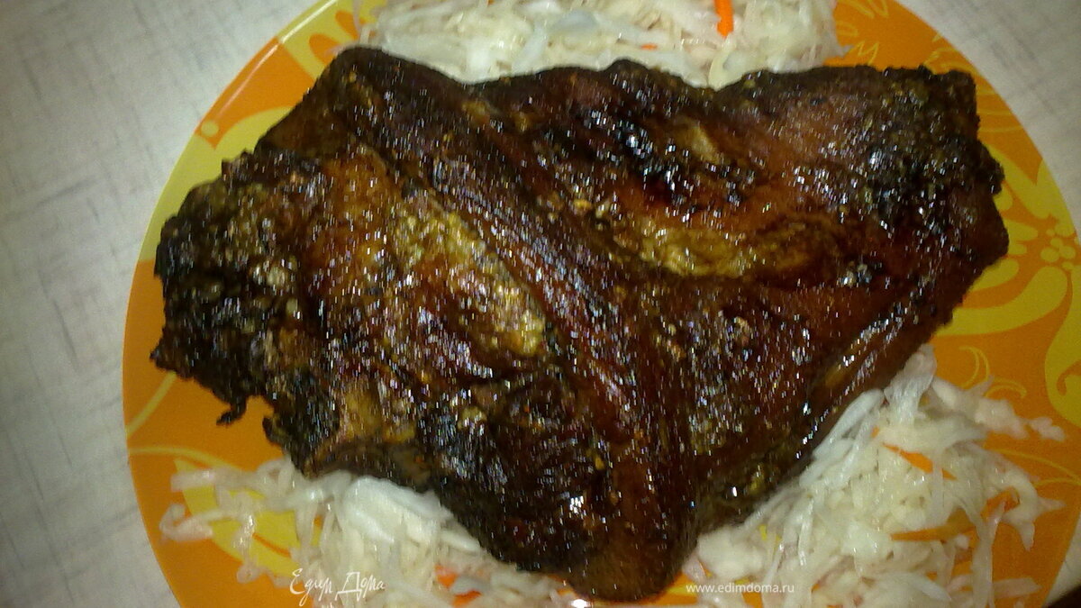 - Шаг 3Когда рулька сварилась, кладем ее на противень, смазываем оставшимся чесноком с маслом и горчицей, отправляем в духовку на 30 мин при 200°C. Периодически поливаем маринадом, в котором варилась рулька. Делаем огонь побольше, чтобы зажарилась.