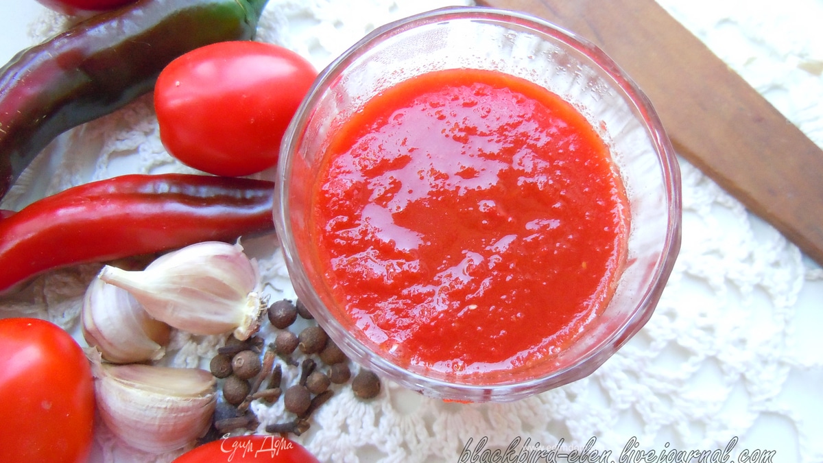 - Шаг 1Поместить массу из протертых помидор в эмалированную посуду и уваривать на одну треть.Когда томат уварен к нему нужно добавить сахарный песок.После растворения сахара в кастрюлю нужно поместить марлевый мешочек с указанным количеством пряностей(перец горошком,гвоздика,чеснок,острый перец) и добавить остальные специи. Уваривание со специями нужно продолжать в течении 10 минут. Далее добавить уксус и соль и кипятить еще 5 минут.По окончании варки мешочек с пряностями вынимается. Готовый соус в горячем состоянии разлить в заранее стерилизованные банки закатать и укутать. Из указанного кол-ва продуктов получается 1литр 700грамм