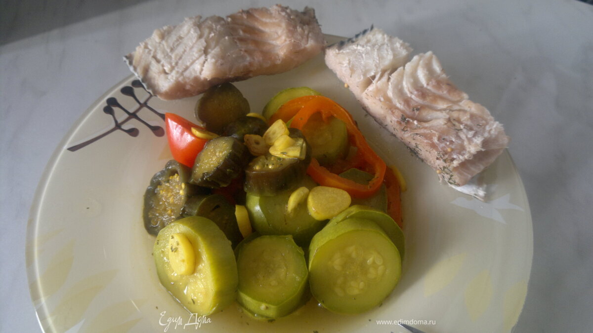 Обжариваем чеснок на оливковом масле, затем добавляем овощи,начала кабачок и баклажан потом перец, тушим добавляя специи и воду 10 минут. Нагреваем воду закладываем специи для бульона и после закипания варим рыбу 15-18 минут.