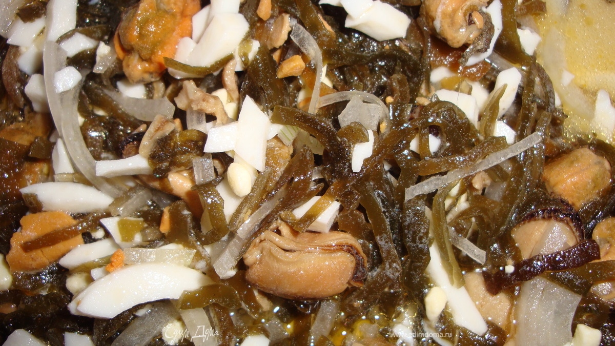 Мелко порезать лук, добавить морскую капусту (если жидкости в баночке слишком много - лучше слить), подкопченные мидии, мелко порубленные яйца, перец и заправить маслом от мидий.