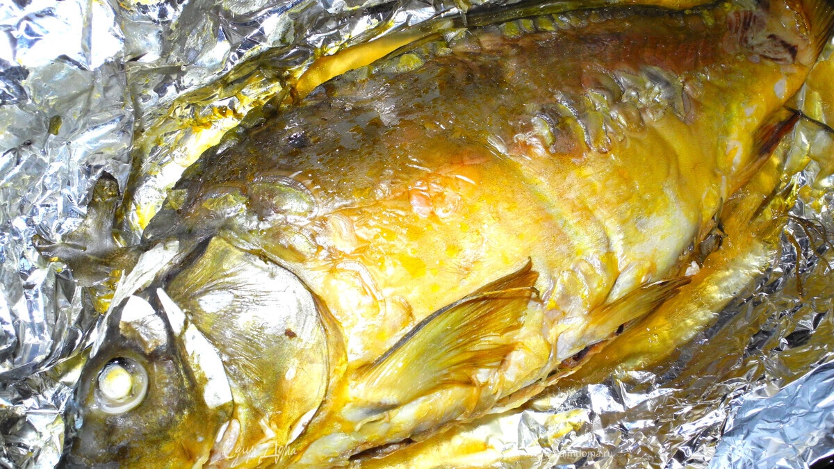 Зашила пузико. Операция прошла успешно. Запечатала в конвертик из фольги и выпекала около часа при температуре 200 градусов. Вот такая красивая золотистая рыбка получилась. - Шаг 5Не все любят карпа, но думаю, что эта начинка подойдет к любой рыбе. Приятного аппетита!