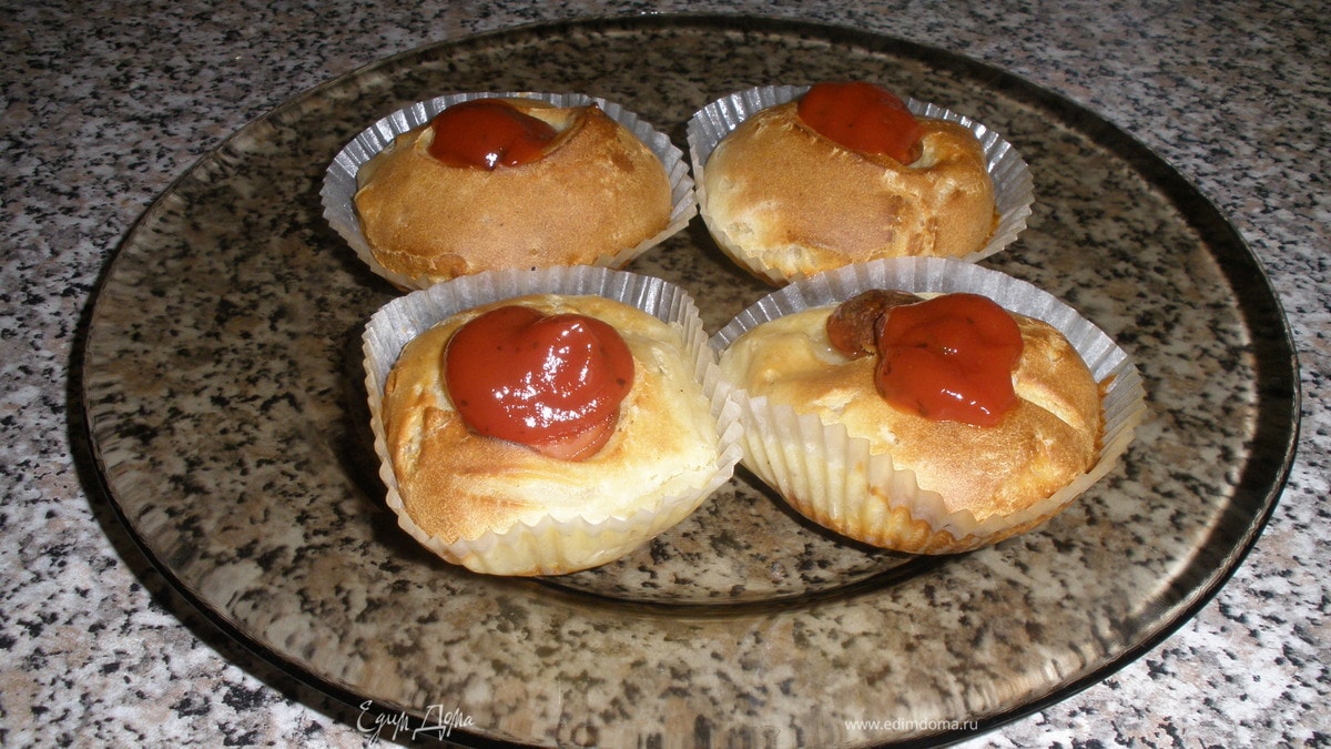 - Шаг 2Смазать формы для маффинов растительным маслом. Сосиски нарезать кружками и уложить по несколько кусочков на дно формочек.Сверху залить тестом до половины формы.Выпекать 25-30 мин.Готовые маффины украсить сверху кетчупом.