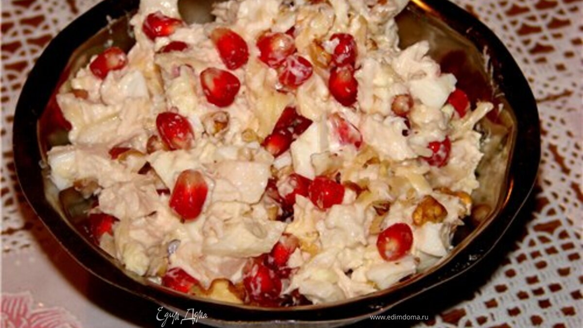 - Шаг 1Окорока отварить, отделить мясо от костей и мелко нарезать. Лук мелко нашинковать и на 15 мин залить кипяченой водой с уксусом (я добавляю обычный репчатый лук). Яйца натереть на крупной терке. Компоненты смешать, добавить подсушенные и измельченные орехи, тертый на терке сыр, зерна граната и заправить майонезом.