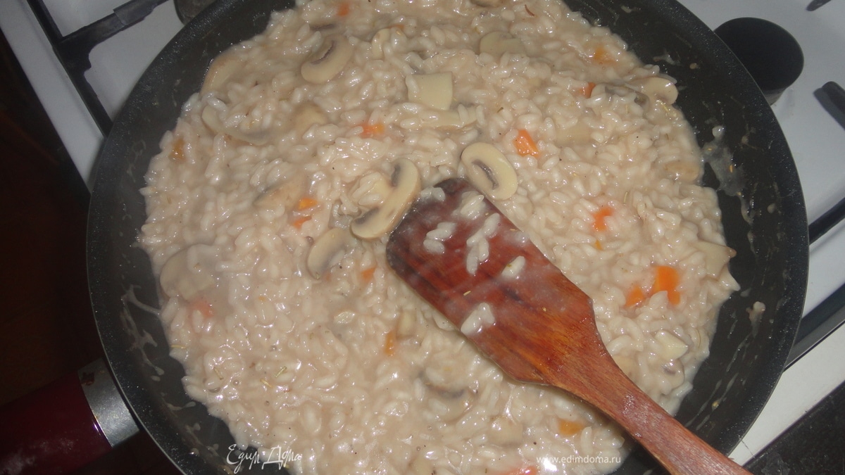 - Шаг 2Поставить сковороду вок на огонь и согреть, добавить сливочное масло и растопить. В топленное масло добавить рис и быстро размешать деревяной лопаткой. После того, как масло впитается полностью в рис, добавить белое вино. После того как и вино впитается, начните добавлять грибной бульон по половнику и перемешивать. В самом конце добавить с бульоном сваренные грибы и морковь, добавить сушенный розмарин по вкусу, посолить и поперчить. Самое гралвное в ризотто - это постоянное помешивание. Рис должен дойти до консистенции al dente (мягкий снаружи, с легкой твердостью внутри).