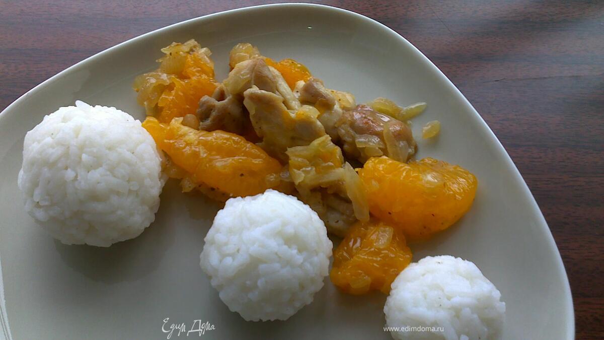 - Шаг 1Сначала отварим рис(как обычно). На сковородке с раскаленным маслом обжариваем нарезанную небольшими кусочками курицу, минут через 10-15 добавляем мелко нарезанный лук, жарим до готовности лука. Добавляем сок из под мандаринов и увариваем. Затем добавляем дольки мандаринов и готовим минуты 2-3. Выкладываем на тарелку рис(я сформировала шарики разных размеров) и нашу курочку с мандаринами. Приятного аппетита!!!
