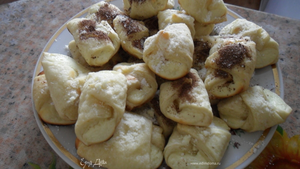 - Шаг 1Готовим тесто:На рабочую поверхность или в миску просеять муку и выложить порезанный на кусочки маргарин или сливочное масло.Лучше всего если оно будет мягкое.Порубить муку с маслом ножом.В воду,комнатной температуры, положить сахар, соль и размешать до полного растворения. В рубленую муку с маслом влить холодную воду и быстро замесить тесто.Постовить в холодильник на 1 час. Готовим начинку: берём творог, вбиваем туда яйцоихорошо перемешиваем. Кладём сахар и всё перемешиваем,до однородной массы. Достаём тесто. Раскатываем 2 раза, каждый раз складывая тесто в 3-4 слоя. делаем ромбики и выкладываем начинку тонким слоем. Скручиваем и ложим на протвень. Ставим в духровку и выпекаем 20 минут при температуре 180С. Достаём.Сверху можно посыпать сахарной пудрой или какао.Приятного аппетита!!!=))