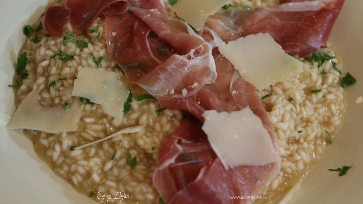Разложить ризотто в тарелки, посыпать петрушкой, сверху выложить ломтики ветчины и хлопья пармезана.