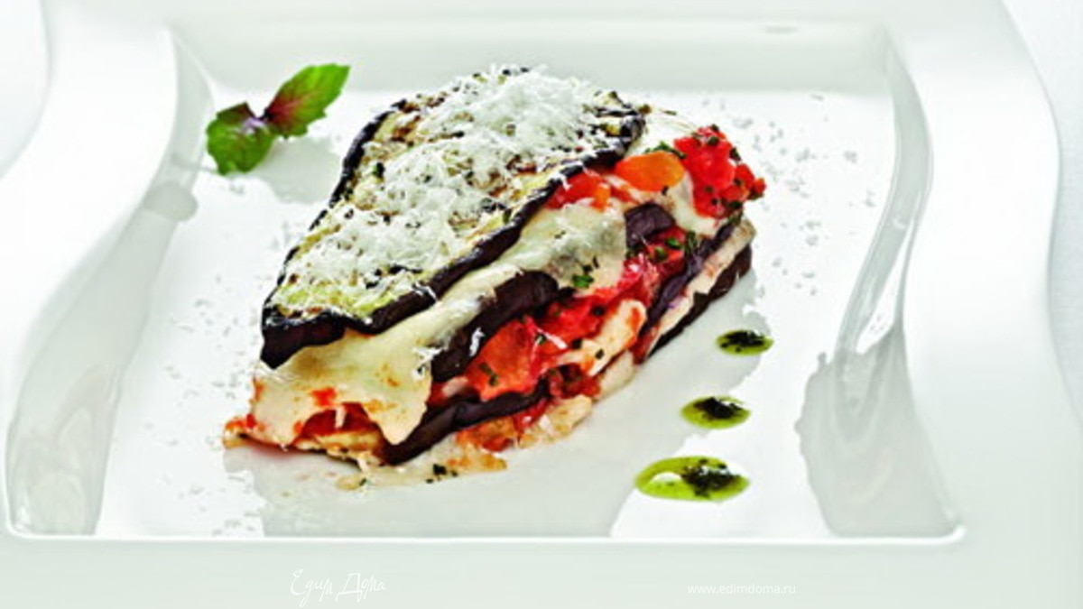 - Шаг 4Нагреть духовку до 220 С. На застеленный пергаментом противень выложить ломтик обжаренного баклажана, на него – ломтик моцареллы, рубленые томаты, базилик, щепотку пармезана. Посолить, поперчить. Накрыть еще одним кусочком баклажана, сверху снова выложить моцареллу, томаты, базилик и измельченный чеснок. Накрыть баклажаном и присыпать пармезаном. Всего должно получиться четыре пирамиды из баклажанов.