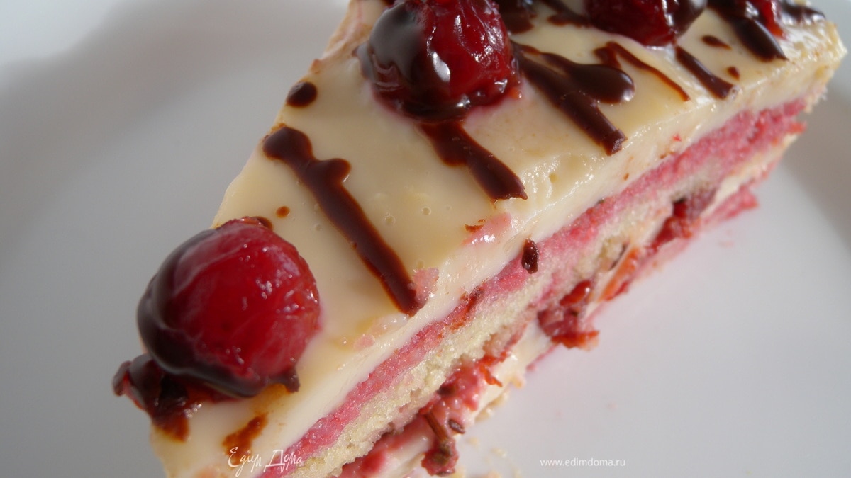 Испечь бисквит (я делала по рецепту Оксанки). Остудить разрезать нитью на 2 коржа. С вишни слить сироп (разделить на 2 части) и пропить сначала один корж, заключенный в кольцо. - Шаг 2