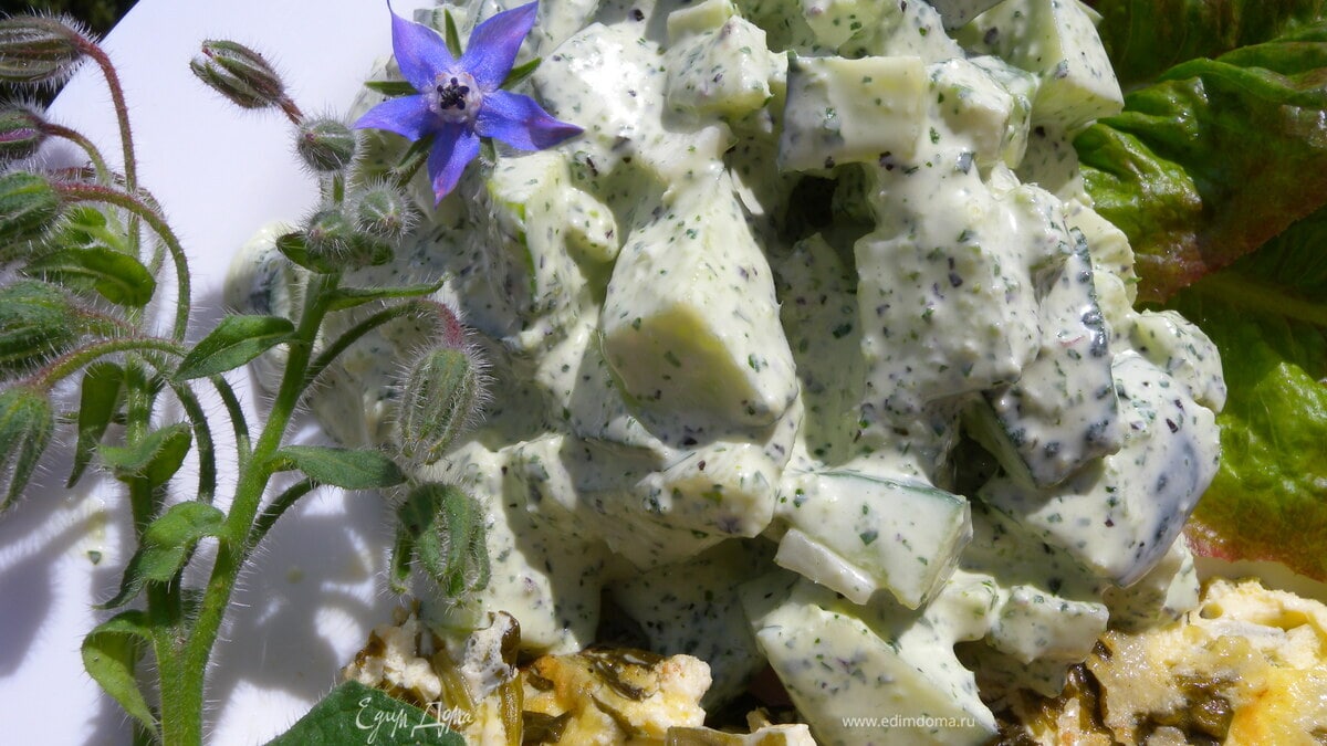 Очень люблю разного рода соусы, но больше всего на йогуртовой или творожной основе. Особый вкус придает БАРАГО. Это огуречная трава. Она очень ранняя и придает вкус огурцов, даже если в салате их нет (у меня в данном салате есть). И еще у этой травы очень красивые цветки :-)