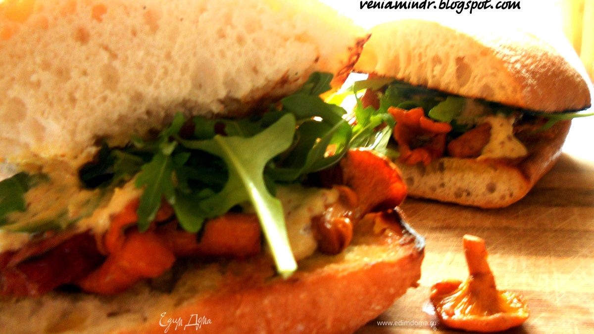 Чиабату нарезать поперек, сбрынуть оливковым маслом, подсушить на сухой сковороде, с двух сторон. На одну половину выложить колбасу, лисички, руколу, немного соуса, сбрызнуть маслом. Накрыть второй половиной и подавать!