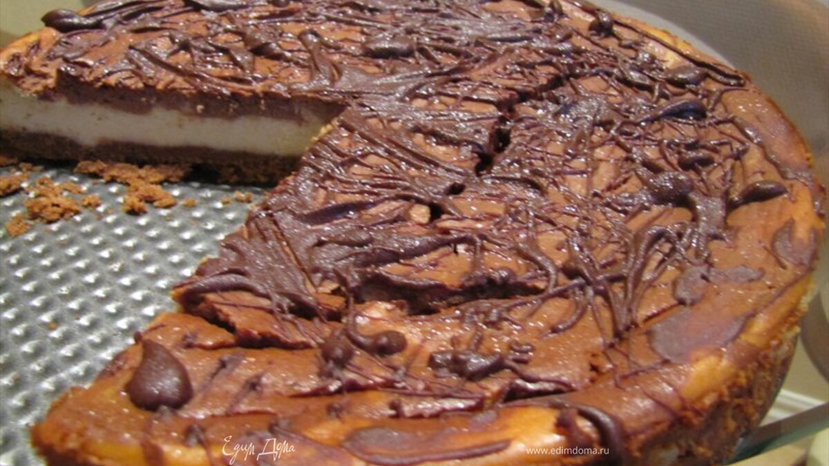 Выливаем на основу сначала светлый крем, а затем темный. Можно сделать красивые белые разводы на поверхности торта) Выпекаем в духовке, куда предварительно поставили емкость с кипящей водой, 1ч 20мин. Пока чизкейк печется лучше духовку не открывать. У готового чизкейка серединка немного подрагивает, но не слишком сильно. Затем готовый торт ставим в холодильник минимум на 4 часа. Чизкейк можно украсить стружкой из белого шоколада, но я полила его паутинкой из оставшегося темного шоколада) Приятного аппетита! Надеюсь вам понравится)