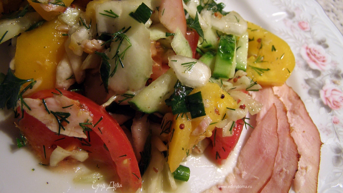 Салат из свежих овощей и копчёной куриной грудки