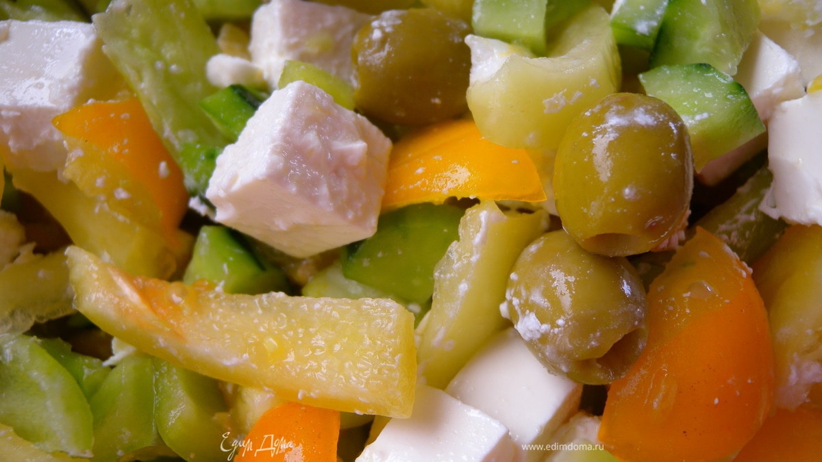 Почистить овощи, порезать. С огурца снять шкуру (чтобы не быть зеленым :-). Фету порезать кубиками. Добавить оливки, тоже в цветовой гамме. Заправить прекрасным, душистым маслом класса экстра фамильного резерва :-) . - Шаг 3