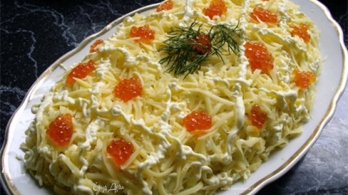 - ПодготовкаРыбу и морепродукты отварить в подсоленной воде. Нарезать крупными кусочками, замариновать в смеси горциы и лимонного сока. Когда все остынет, добавить рис,натертые на терке (крупной) огурчик и сыр. Заправить салат майонезом. Икру выкладывать порционно в тарелки или украсить верх салата кучками. Перемешивать с икрой непосредственно перед едой.
