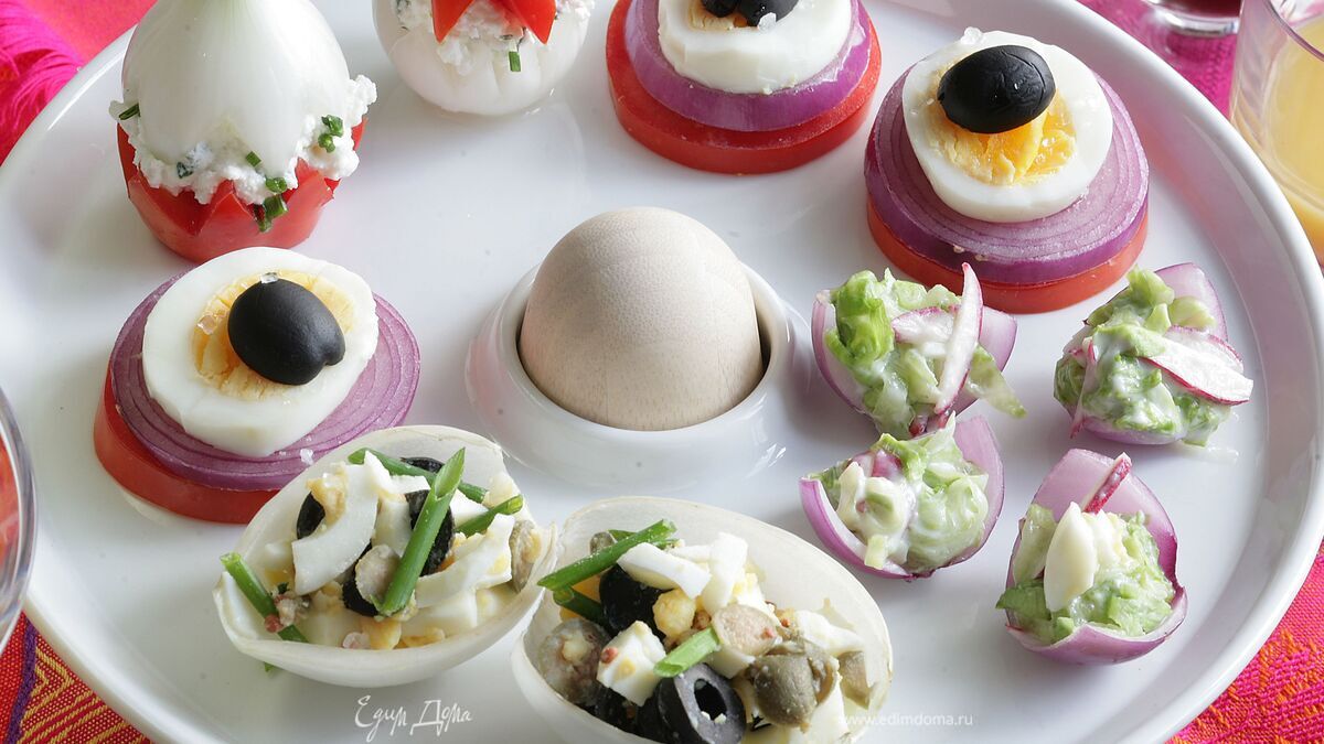 - Шаг 1Первая: 1. Луковицы и помидоры надрезать вдоль так, чтобы получились зубчики, и аккуратно раскрыть. 2. В середину каждой луковицы выложить чайной ложкой сыр, сверху накрыть половинкой помидора. По желанию можно заправить оливковым маслом и бальзамическим или винным уксусом. Вторая: 1. Аккуратно разрезать луковицу вдоль пополам и очень осторожно вырезать середину, чтобы остались нетронутыми внешние слои. 2. Маслины нарезать колечками, добавить очень мелко порубленные каперсы, перья зеленого лука и измельченные куриные яйца. 3. Все перемешать, заправить оливковым маслом, солью, по желанию сбрызнуть бальзамическим уксусом (1 ст. ложка) и выложить полученную смесь в луковые лепестки. Третья: 1. Яйца залить холодной водой, довести до кипения и оставить кипеть еще 3 минуты, затем залить их холодной водой. 2. После того как яйца остынут, очистить их от скорлупы и нарезать поперек кружочками. Так же нарезать очищенный лук и помидоры. 3. Разложить на блюде кружочки помидоров, на них выложить лук, затем яйца, украсить сверху половинками маслин и присыпать морской солью. Для надежности всю конструкцию можно закрепить шпажками. Четвертая: 1. Нарезать редис, айсберг и яйцо мелкой соломкой, посолить и заправить йогуртом. 2. Луковицы разрезать вдоль на 4 части. Разделить слои лука, чтобы получились лодочки. Каждую лодочку нафаршировать получившимся салатом.