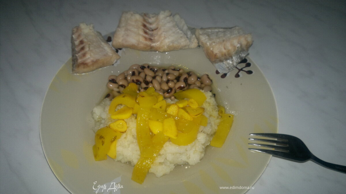 Отварная белая рыба + пюре из цветной капусты,тушеный перец и фасоль
