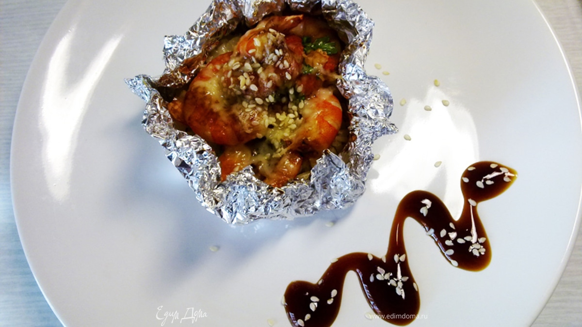 Из фольги сформировать формочку глубиной 4-5 см. На дно формочки выложить рис, сверху уже свареные креветки, полить соусом терияки, присыпать зеленью и кунжутом. Отправить формочку на противне в духовку на 15 мин.