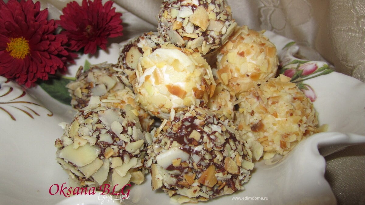 Половину шариков обвалять в растопленном белом шоколаде, затем в миндальных крошках. - Шаг 7